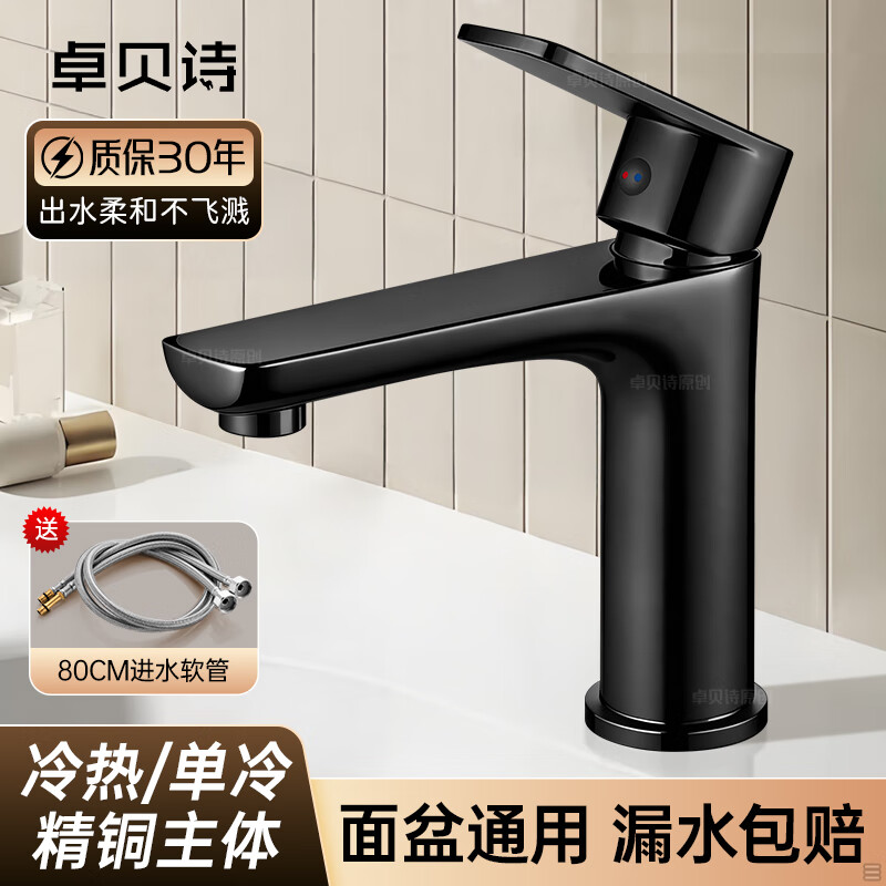 卓贝诗 德国面盆水龙头洗脸盆洗手池台盆卫生间洗漱台防溅单冷热水龙头 黑色【加重精铜主体-细腻出水】 单冷款丨配80cm进水软管*1