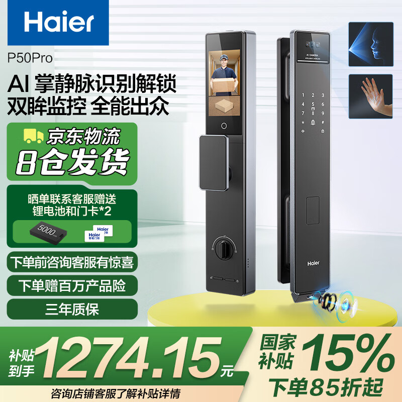 海尔智能门锁 上下双摄掌静脉 人脸识别 家用指纹锁 密码锁 入户门 HFD-P50Pro-CA