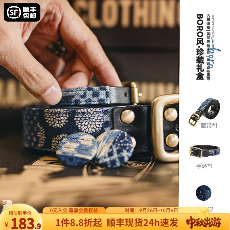 马登工装Boro风古布时尚礼盒设计师真皮手环黄铜单针腰带徽章送礼套装 古布【典藏版礼盒】 【腰带+手环+徽章】 均码