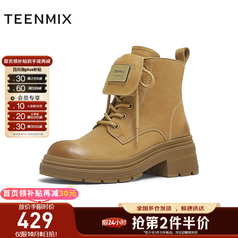 天美意马丁靴短靴系带厚底纯色圆头户外时尚女靴2025新款KDX18DD5 卡其色 37