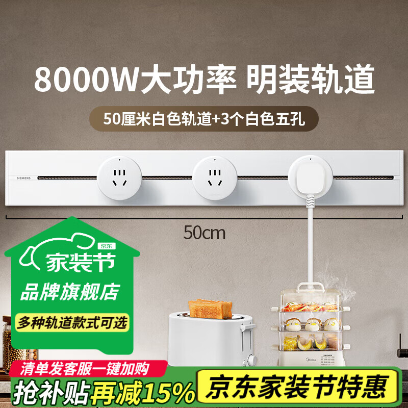 西门子(SIEMENS)S10轨道插座 8000W大功率多功能轨道插座 0.5米/白色轨道+3个白色五孔