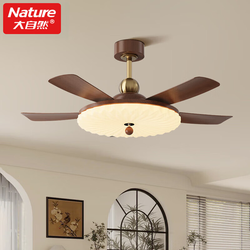 大自然照明52寸客厅风扇灯中古风胡桃木色复古2025年新款直叶一体吊扇餐厅灯 【3021】胡桃木色+电镀金色 52寸 TM精灵