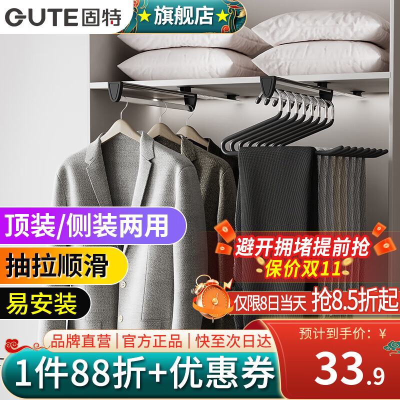 固特(GUTE)裤架抽拉伸缩架衣柜裤挂滑轨伸缩架裤抽收纳多功能挂衣杆晾衣架 顶/侧两用款(柜深≥50.5)黑色