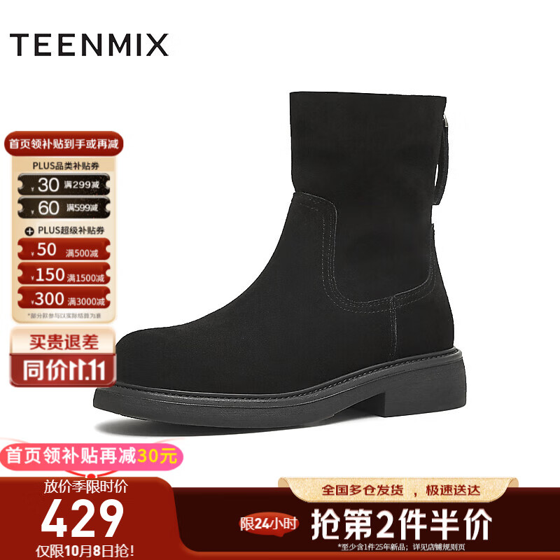 天美意短靴纯色复古百搭后拉链女靴显瘦女时装靴2025新款KNZ13DD5 黑色 36