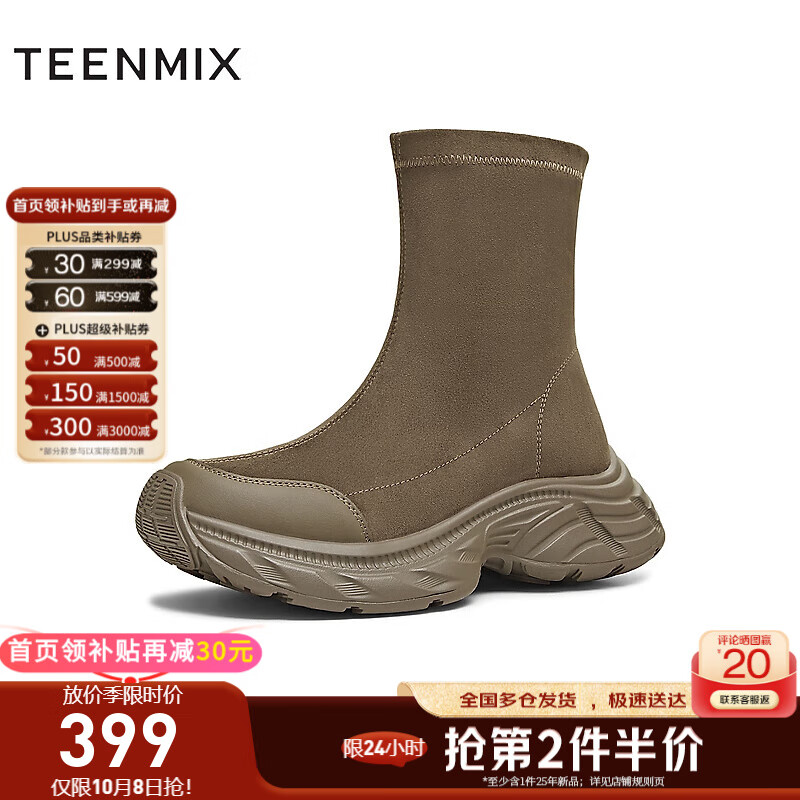 天美意弹力靴厚底百搭短靴一脚蹬显瘦百搭女靴2025新款KTX24DZ5 啡色 37