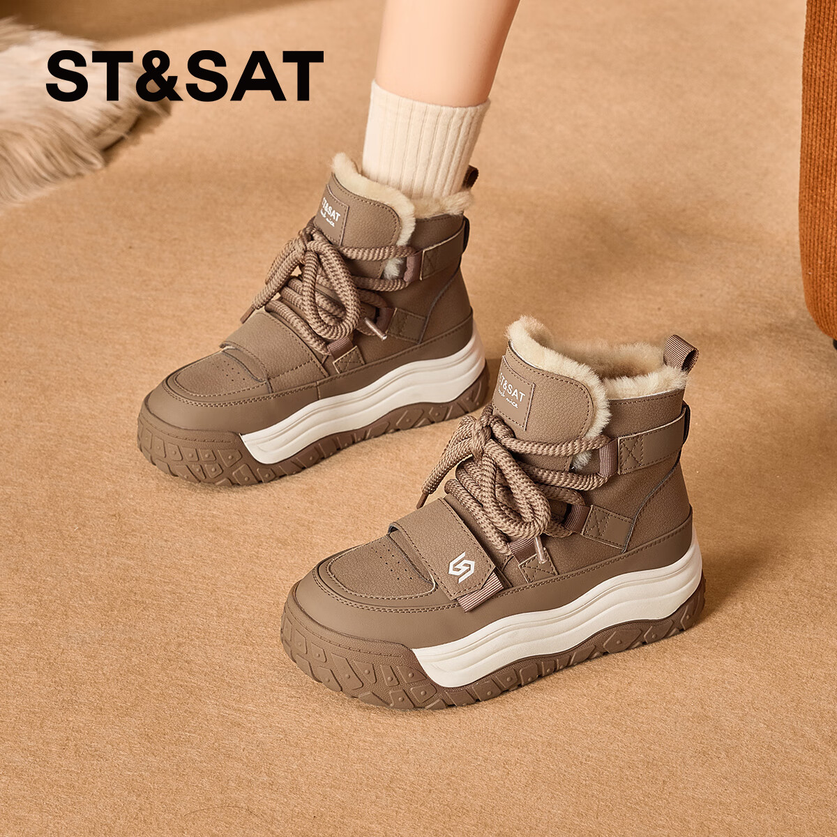 星期六厚底雪地靴女2025新款冬季皮毛一体小白鞋子加厚保暖马丁靴 卡其色 35