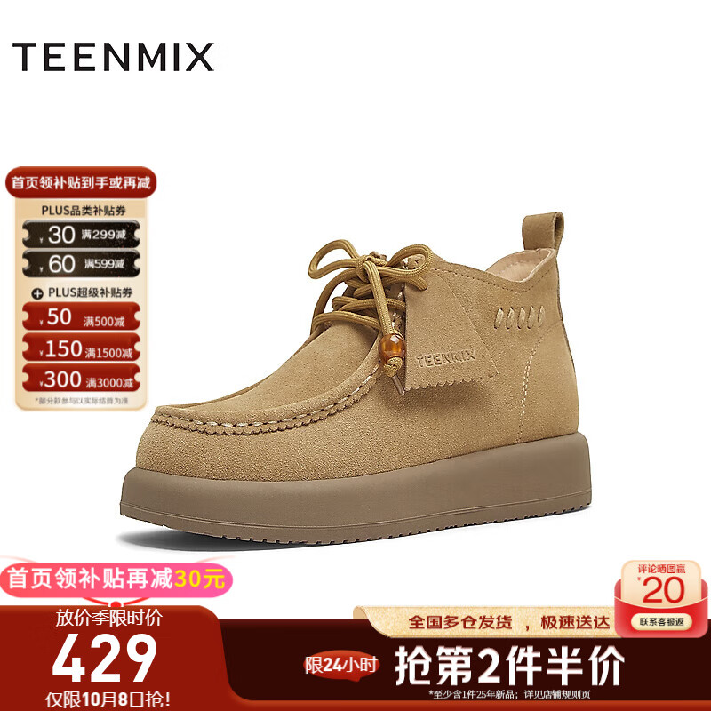 天美意高帮短靴商场同款袋鼠鞋百搭女靴复古女时装靴2025新款 棕色 34