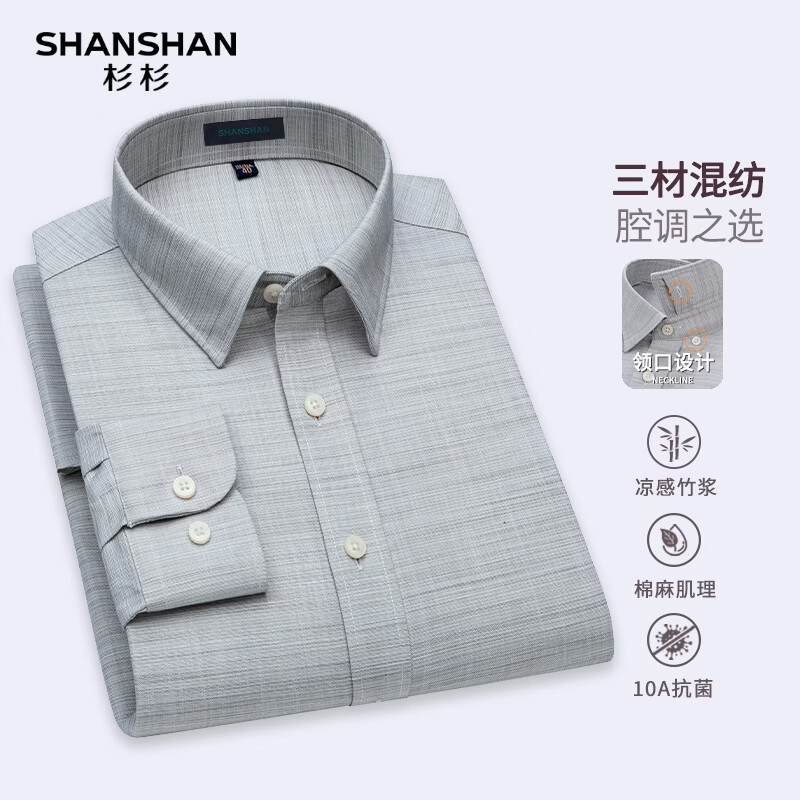 SHANSHAN杉杉【棉+亚麻+竹纤维】长袖衬衫男春季10A抗菌商务休闲男士衬衣 雾霾蓝 41 /175
