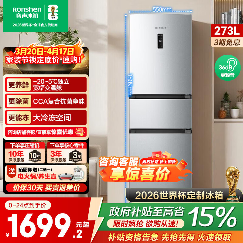 容声273L三门小冰箱小户型超薄一级能效风冷无霜变频节能出租房家用以旧换新BCD-273E20RNLAJ