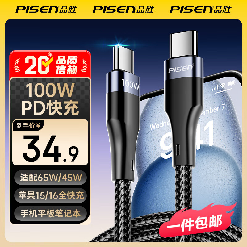 品胜(PISEN)苹果17充电线双头type-c数据线PD100W快充c to c车载5a适用iPhone17/16/15手机iPad华为Mac笔记本 【编织黑100W】苹果17/16电脑1.5m