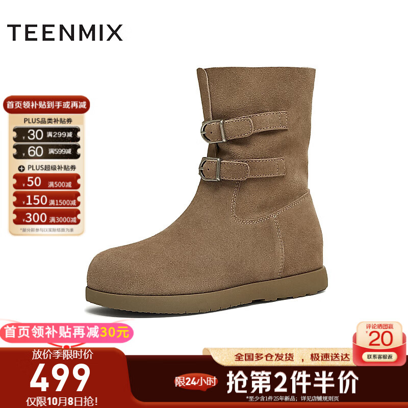 天美意西部靴纯色百搭复古堆堆靴短靴户外女靴2025冬新款 卡其色 34