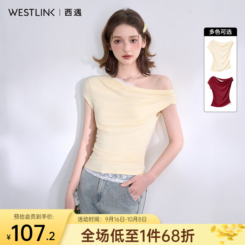 西遇【拼接蕾丝】气质优雅一字肩不规则T恤女夏季荡领上衣 黄色 S (155)