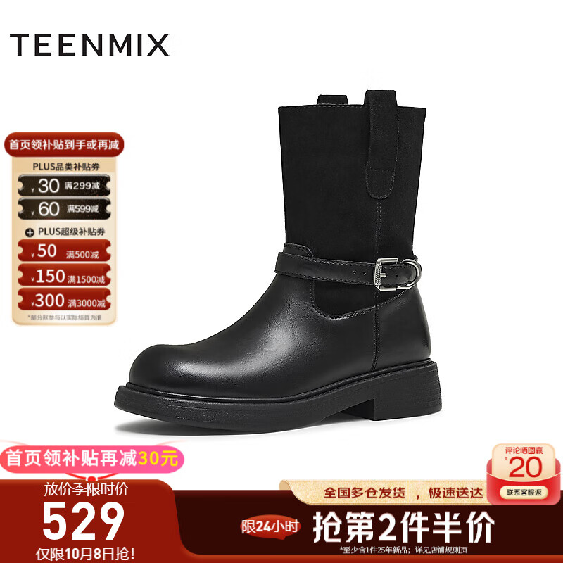 天美意女靴休闲一脚蹬短靴复古金属扣女时装靴2025新款KNZ10DZ5 黑色 37