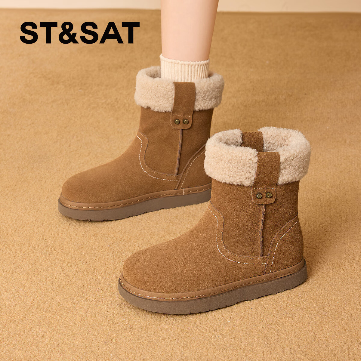 星期六厚底皮毛一体雪地靴女2025新款冬季真皮加绒短靴加厚保暖毛毛棉鞋 驼色 【加绒保暖】跟高4.5cm 37