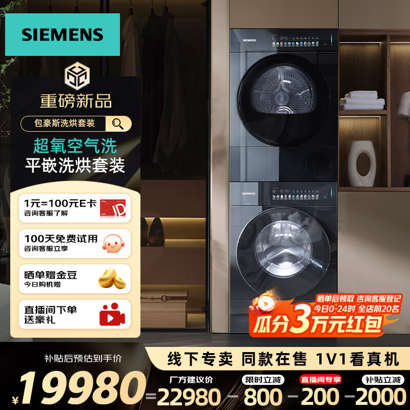 西门子(SIEMENS)包豪斯新品10公斤滚筒变频洗烘套装 纯平嵌入 超氧空气洗 蒸汽除皱 智能投放 热泵烘干 除菌除螨 家电补贴20% 【套装】WG54M7D20W+WQ55M7U20W