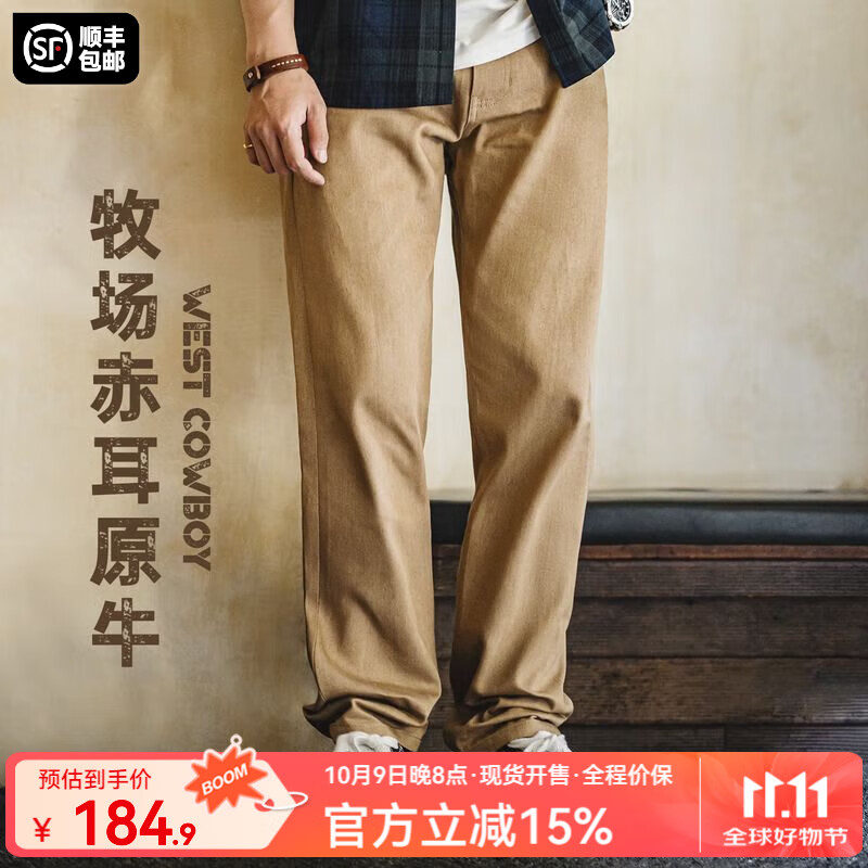 马登工装美式复古西部牧场男士牛仔裤秋卡其赤耳原牛男士直筒休闲裤子 卡其灰 34