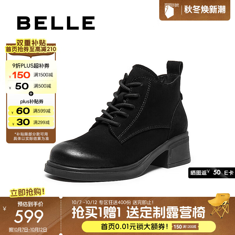 百丽(Belle)简约复古马丁靴女2025冬新真皮粗跟增高百搭休闲短靴3NW51DD5 黑色 34