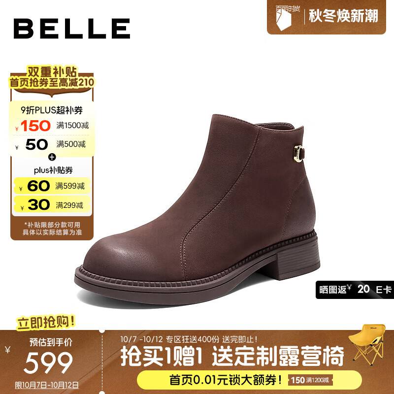 百丽(Belle)复古羊皮褶皱面时装靴女2025冬新商场同款粗跟短靴E4Y1DDD5 咖啡色-绒里 37