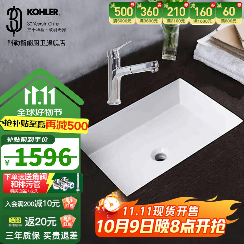 科勒(KOHLER)台下盆陶瓷洗脸洗手盆维克加长型平底方形台盆洗面盆 2889T+33070T抽拉龙头