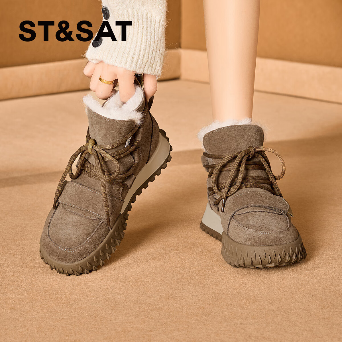 星期六厚底增高雪地靴女2025冬季新款加绒保暖棉鞋东北防滑防寒毛毛短靴 卡其色【加绒】 【寒冬保暖】跟高4cm 35