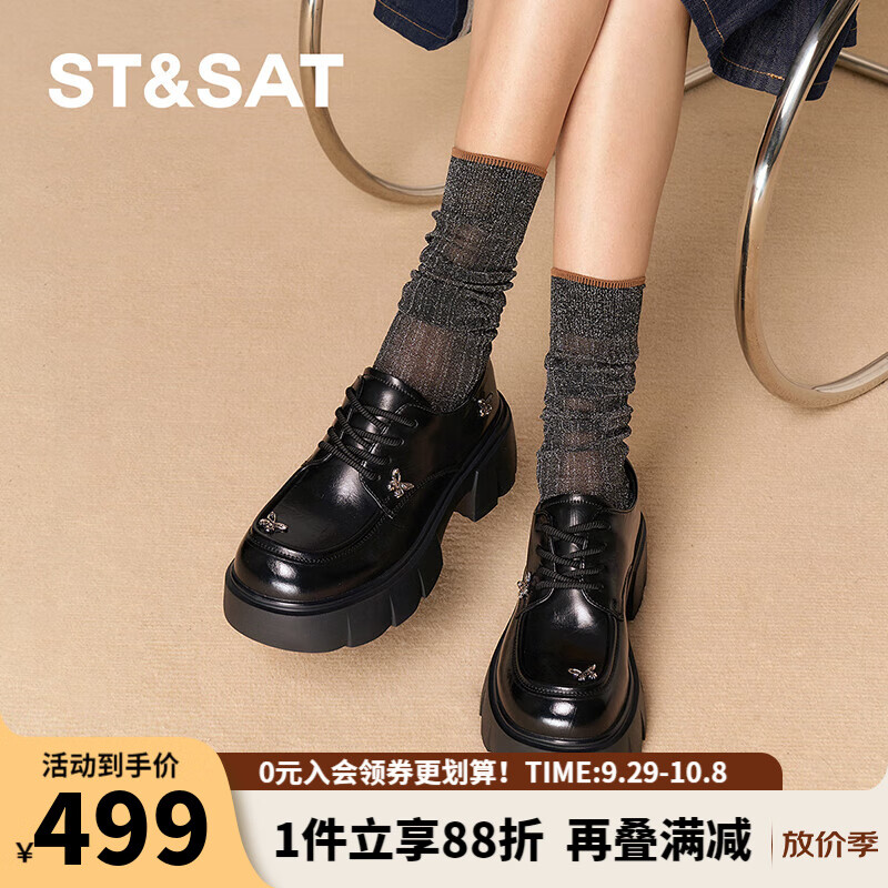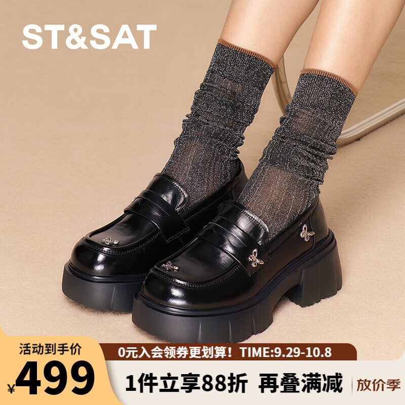 星期六高跟女乐福鞋2025秋季新款英伦风蝴蝶配饰小皮鞋SSD3111492 黑色 34