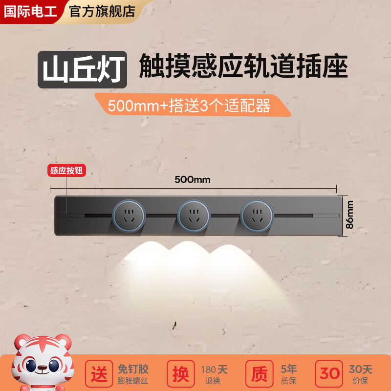 FDD国际电工山丘灯触摸感应轨道插座移动厨房书房多场景明装可移动8000w插排 山丘灯轨道插座50cm+3个五孔【灰色】