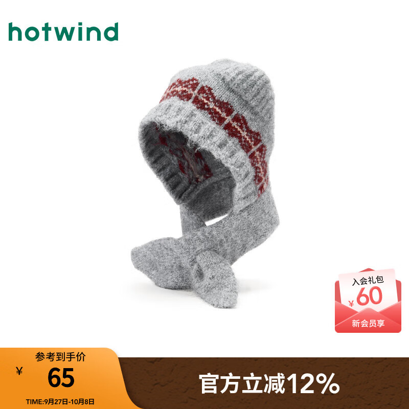 热风(Hotwind)女士帽子2025年冬季新款提花猫耳护耳毛线帽卡通二合一围巾 09灰色 56-60cm