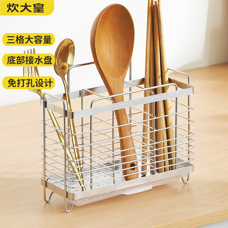 炊大皇厨房置物架不锈钢筷子收纳盒壁通风挂式放筷子筒免打孔沥水筷笼架 A1【本色不锈钢】扁钢双格筷子笼