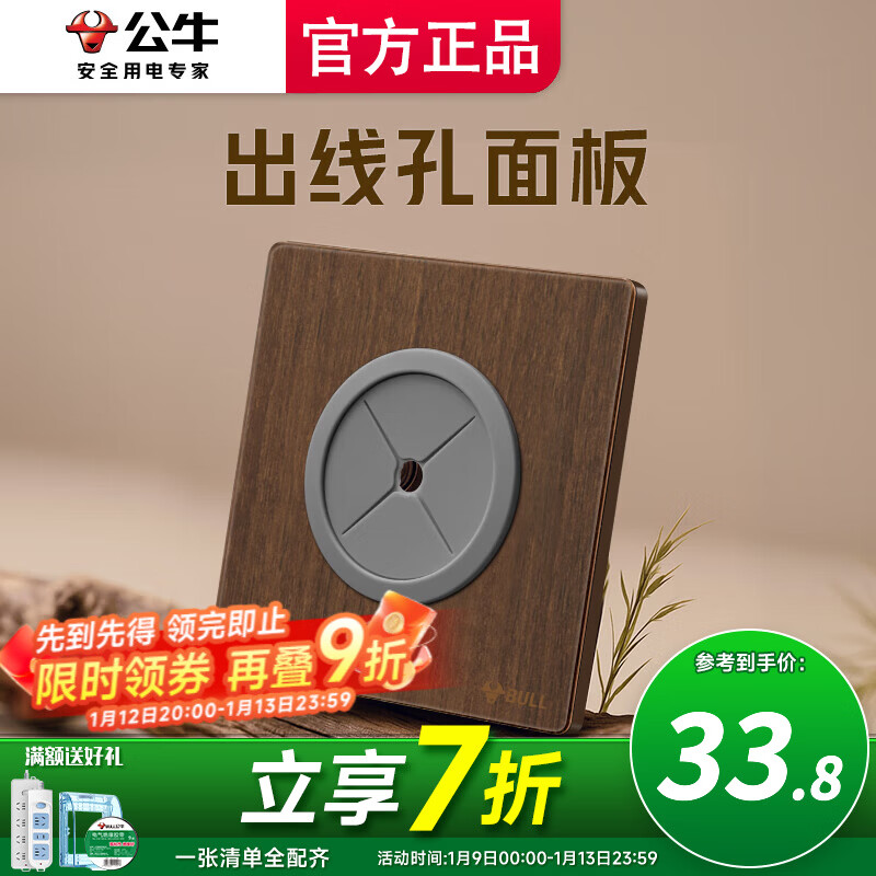 公牛(BULL)插座面板出线孔插座家用超薄拨杆G70胡桃木86型复古开关仿木纹 出线孔面板