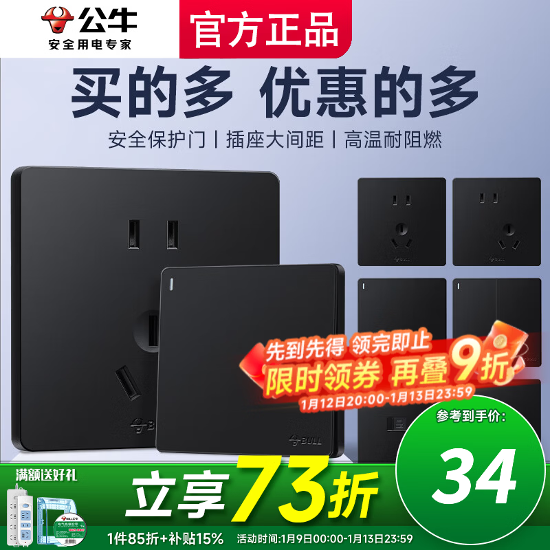 公牛(BULL)开关面板带开关插座G12皓钻黑86型暗装墙面五孔带USB插座网络 清单全配齐