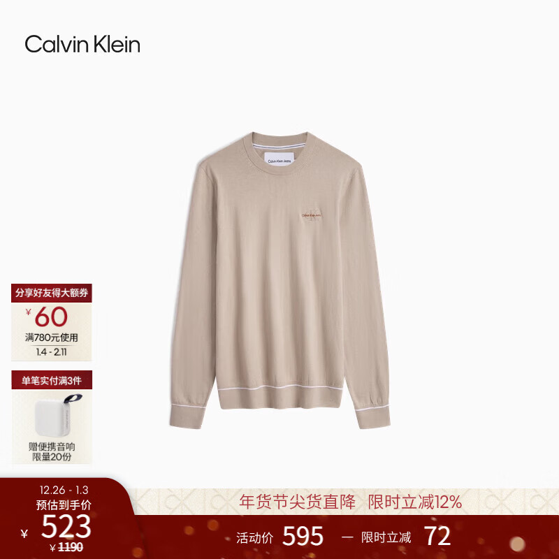 Calvin Klein Jeans秋冬男士简约ck字母刺绣舒适圆领打底衫毛衣针织衫J324490