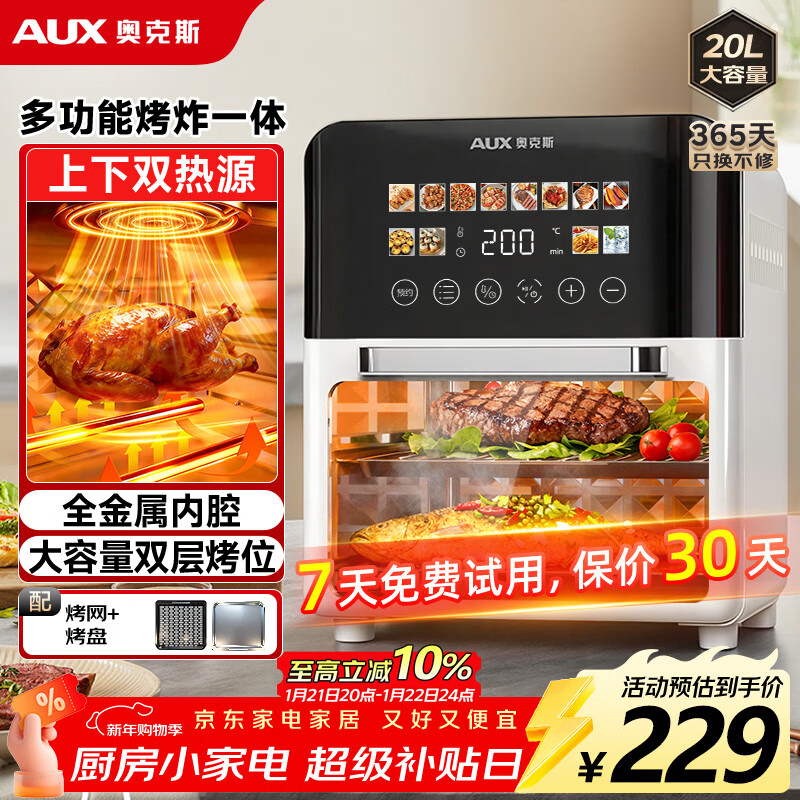 奥克斯(AUX)空气炸锅20L家用2026年新款可视窗口大容量上下双热源免翻面全自动多功能触屏烤箱一体机金属内腔