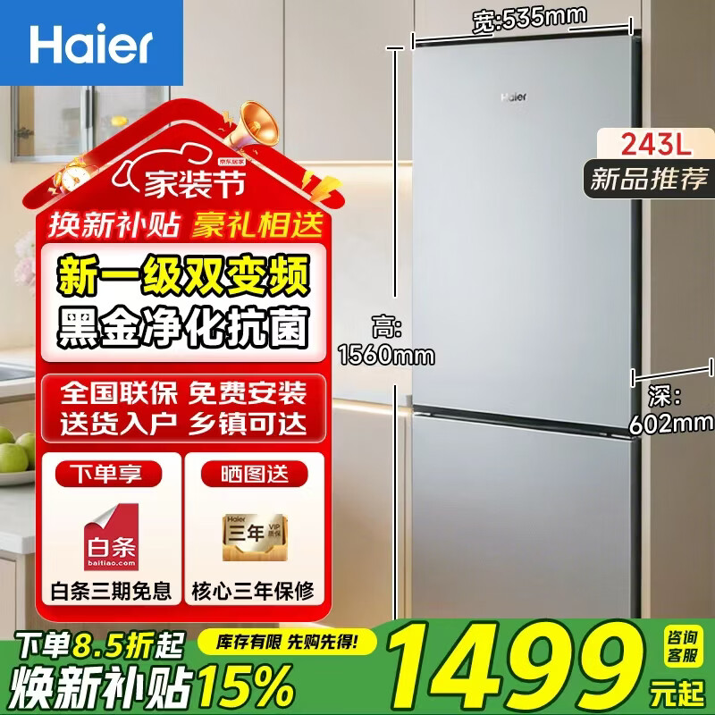 海尔冰箱243L升一级能效双变频风冷无霜净味保鲜双开门小户型家用办公节能两门电冰箱 新一级双变频+三档变温+黑金净化+净味保鲜