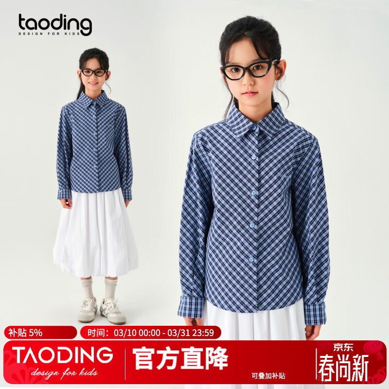 淘町女童格子衬衫春季新款法式经典复古学院风纯棉长袖格纹衬衣女 藏青蓝格 160 /M|80斤-105斤儿童/成人