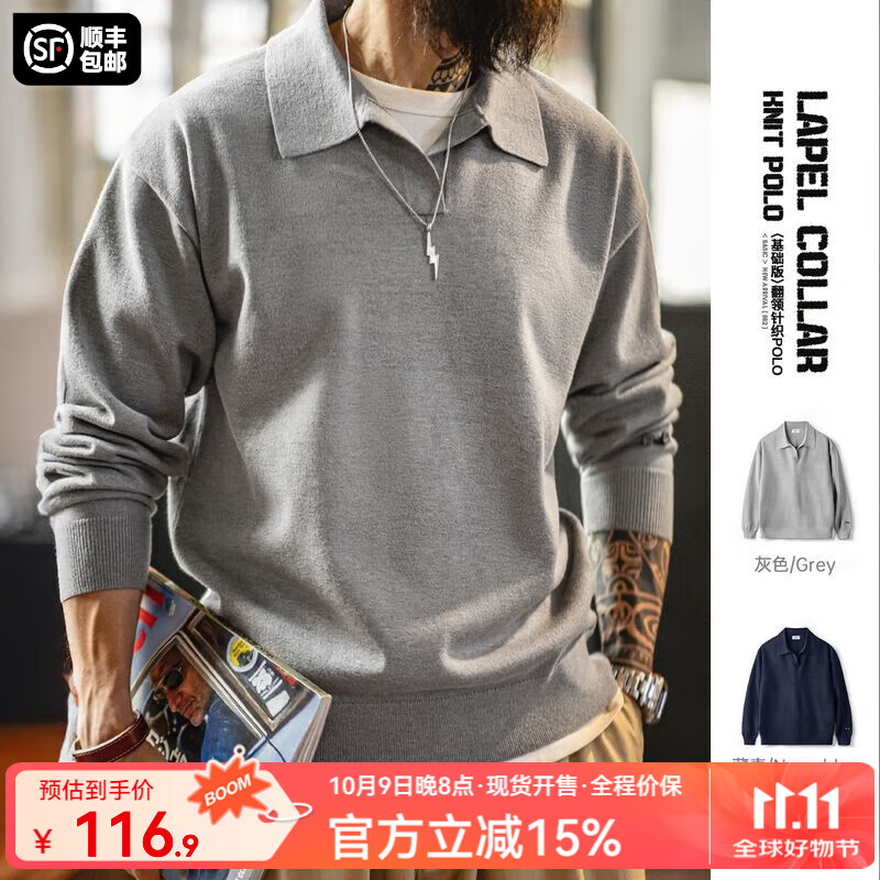 马登工装美式休闲海鸥polo领卫衣男老钱风灰色针织男士长袖polo衫秋季 灰色 XL