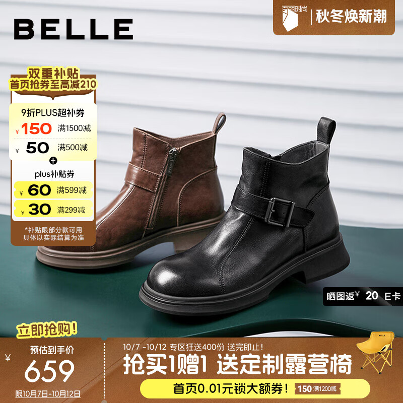 百丽(Belle)复古牛皮皮带扣时装靴女2025冬新商场同款抓皱短靴E8P1DDD5预售 棕色-单里 37