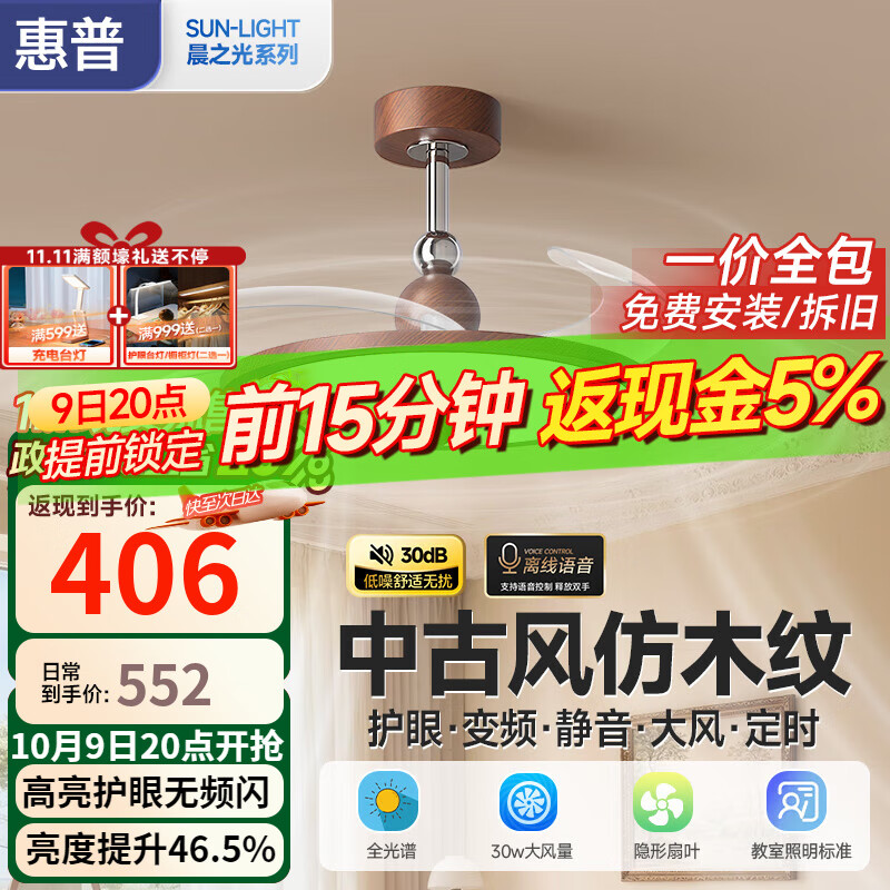 惠普风扇灯餐厅吊扇风扇卧室电扇灯客厅家用一体吊灯中古风隐形风扇灯 中古风42寸-吊杆-离线语音