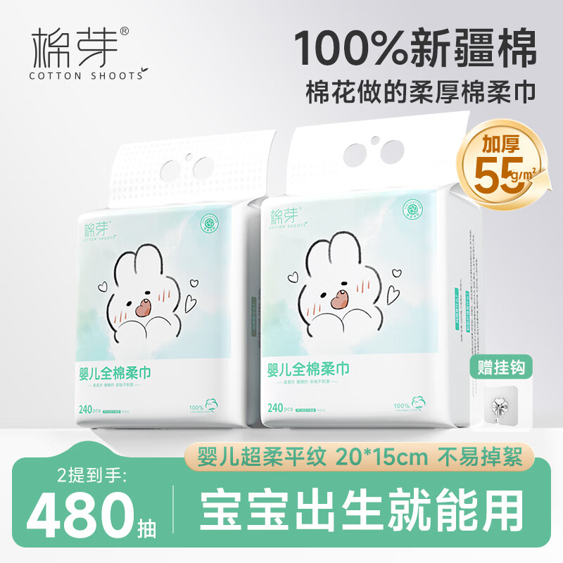 棉芽(COTTON SHOOTS)婴儿棉柔巾240抽*2提悬挂壁挂洗脸巾干湿擦脸
