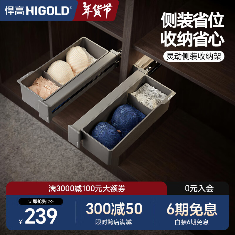 悍高(HIGOLD)衣柜收纳盒抽屉式侧装内裤袜子收纳神器多功能储物盒衣柜拉篮 高级灰|带阻尼|左右可装 内深≥433mm