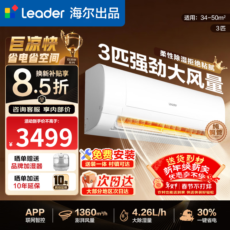 海尔(Haier)智家出品统帅空调大2匹/3匹变频冷暖挂机家用壁挂式空调巨凉快以旧换新节能省电静音 高温自清洁+柔性除湿 3匹大挂3级能效