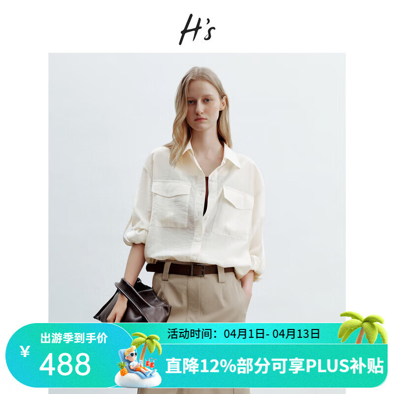 H's米色衬衫外套女26夏季新款高级设计感工装风宽松落肩衬衣上衣 流光米 S