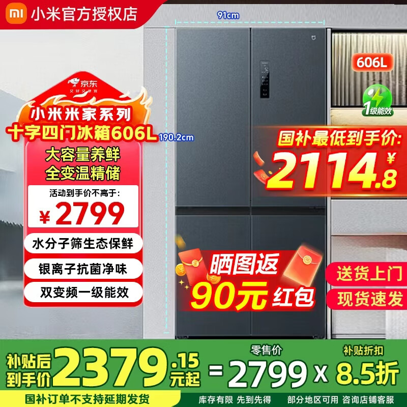 小米(MI)米家冰箱606L十字对开门四门大容量家用电冰箱一级能效超薄嵌入除菌BCD-606WMFSA 606升十字对开