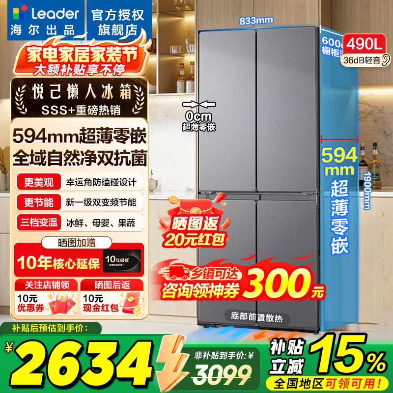 海尔冰箱出品统帅悦己520系列490L十字门冰箱超薄零嵌入一级能效风冷净化电冰箱以旧换新 【悦己520】零嵌+黑金净化490L