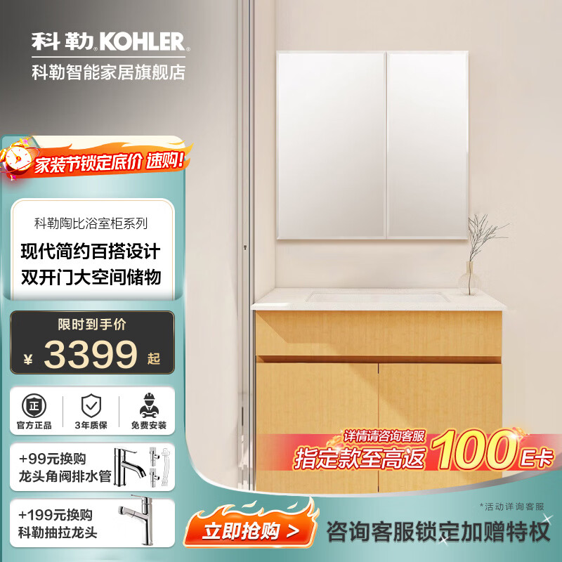 科勒(KOHLER)科勒陶比浴室柜家用卫生间台下盆洗脸盆奶油风小户型挂墙浴室柜 80cm竹木纹浴室柜|铝合金收纳全面镜|易洁陶瓷盆