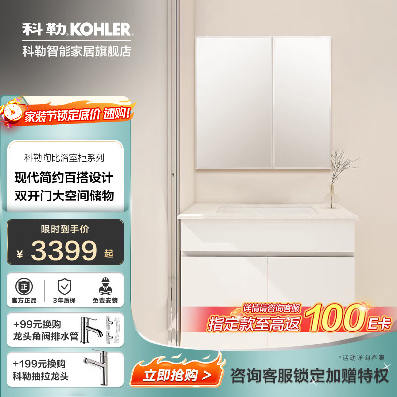 科勒(KOHLER)科勒陶比浴室柜家用卫生间台下盆洗脸盆奶油风小户型挂墙浴室柜 80cm暖白色浴室柜|铝合金收纳全面镜|易洁陶瓷盆