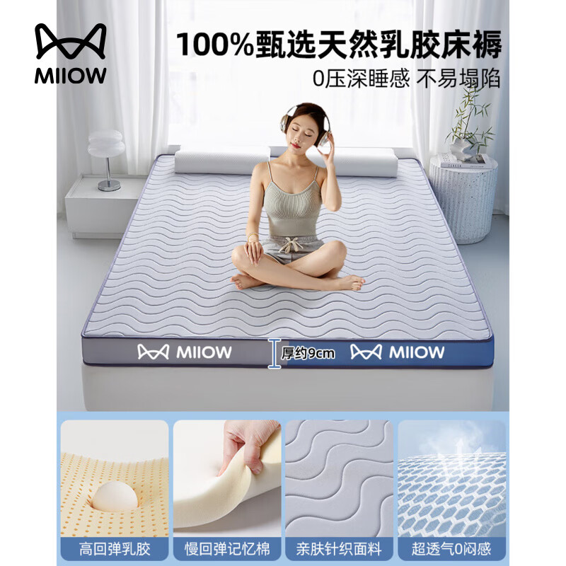 猫人乳胶床垫遮盖物1.5米x2米 床褥垫子海绵垫宿舍单双人软垫 【厚约9cm】波浪灰+蓝灰围边 120*190cm单人床