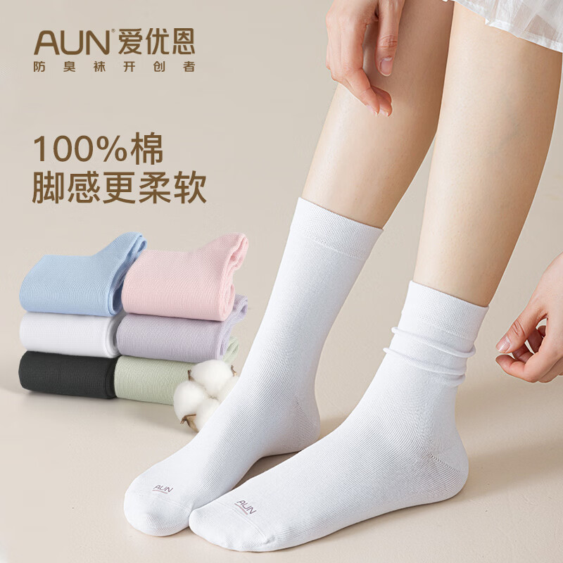 AUN袜子女冬季100%纯棉中筒女士袜子抗菌防臭全棉抗起球吸汗休闲女袜 【100%纯棉抗菌】混色中筒袜 6双 均码