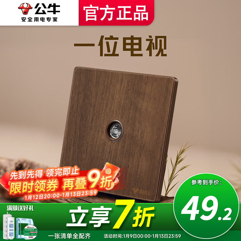 公牛(BULL)开关插座面板电视插座家用超薄拨杆G70胡桃木86型复古开关仿木纹 一位电视