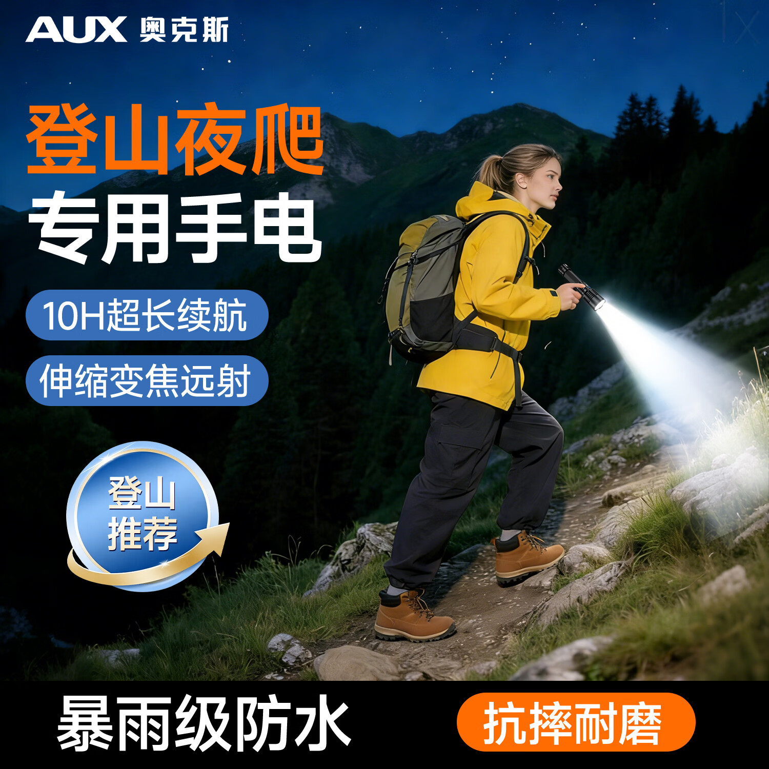奥克斯(AUX)登山夜爬强光手电筒充电户外超亮远射长续航便携防水徒步性能手电 【登山夜爬徒步专用】10H长续航-单锂电