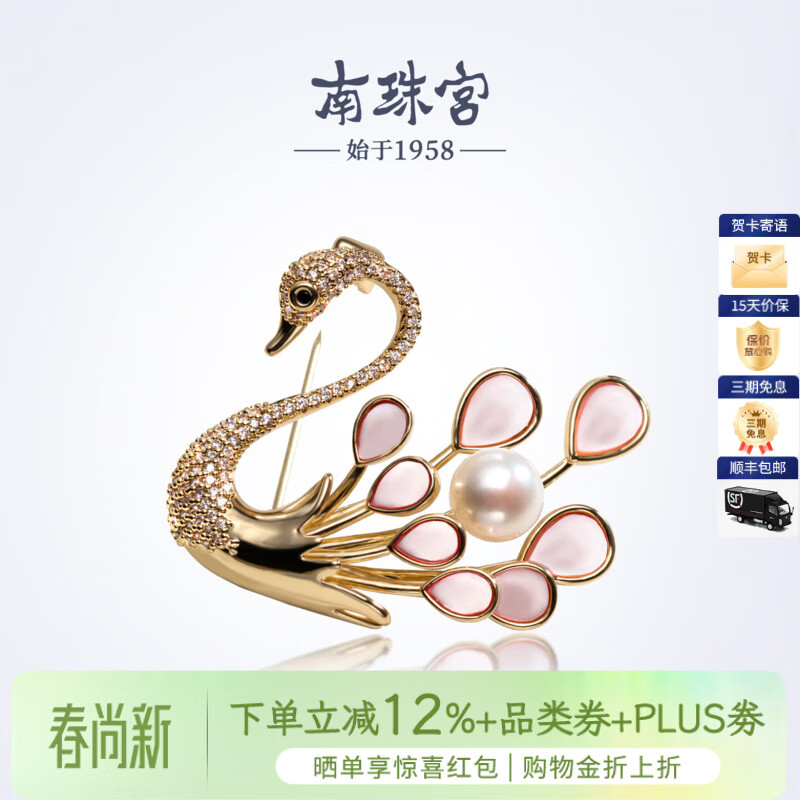 南珠宫天鹅淡水珍珠胸针优雅百搭年轻款生日礼物送女友H107D-J 8.0-9.0mm